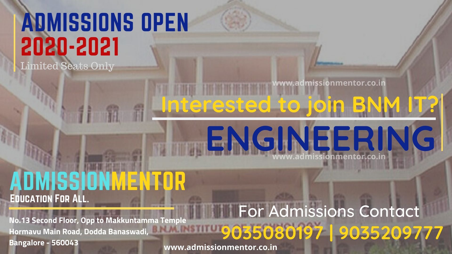 B.N.M. Institute of Technology is a private technical co-educational school located in Banashankari 2nd Stage, Bangalore, Karnataka, India. The school was established in 2001 and is affiliated to the Visvesvaraya Technological University, Belgaum. It is a part of BNMEI, established by the Trust M/s.
